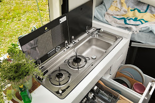 temperature), including hose and shower head in the back. An electrically powered step, which moves out in front of the sliding door, makes getting in and out easier, while mosquito nets in the sliding door and prop-open camper windows are also part of the standard specification. The Grand California is fitted as standard with the Composition Audio radio system.
